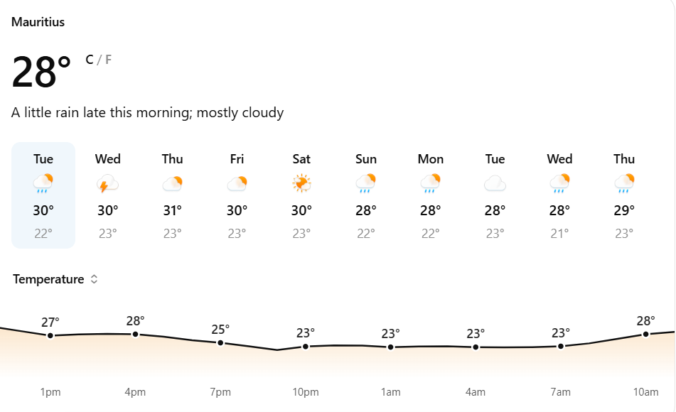 Overall, Mauritius will experience typical tropical weather conditions over the next 7 days, with a combination of sunshine, clouds, and periodic rainfall. While no severe weather systems are currently expected, localized thunderstorms may temporarily affect certain regions.